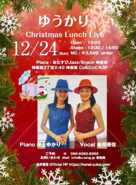 昨夜ご一緒した、優佳さんとのクリスマスランチライブ❣️来月24日お昼に、神楽坂に移転した「おむすびジャズ」にてお届けいたします❣️「ゆうかり」では初出演なひととき、どうぞごゆっくり😊💕😊 ◆12/24(日)◆ 「ゆうかり