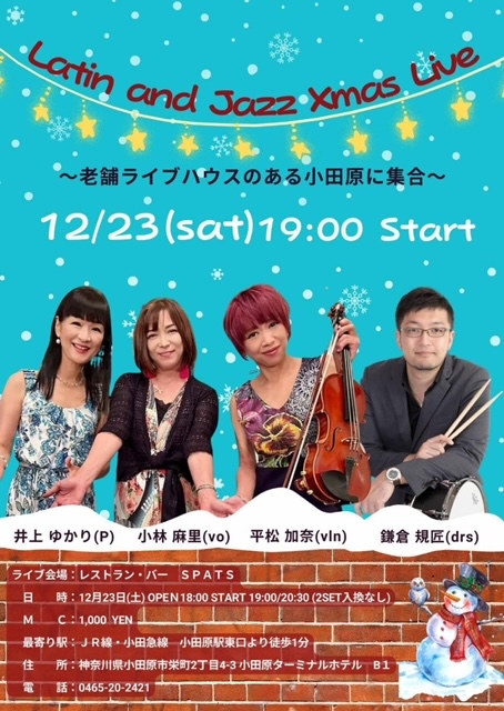 今週末23日は小田原「スパッツ」にて、麻里さんと加奈ちゃんと規匠さんと❣️初出演させていただくスパッツのひととき、どうぞごゆっくり😊💕😊 ◆12/23(土)◆「初出演!」 小田原「スパッツ」(0465-20-2421)p