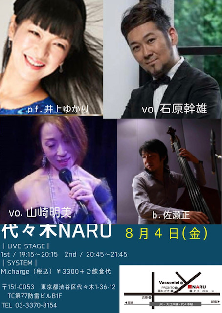 今週4日のステージは、ボーカリストがkanakoさんから石原幹雄さん&山崎明美さんに急きょ変更となりました。みなさまどうぞご了承くださいね😊🙏😊🙏