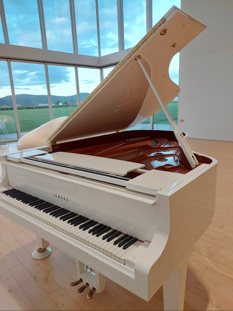 東川町地域交流センターで出会った、白いYAMAHAピアノ❣️遠軽あたりの森の木から作られてるのかも。素敵な吹き抜けの空間に、とても似合っていました😊🎹😊