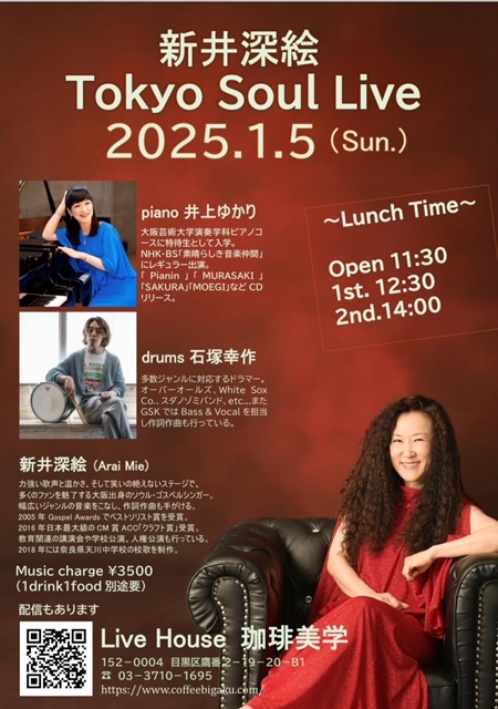 来年1/5に初共演させていただく、ボーカル新井深江さんとドラムス石塚幸作さんとの初トリオ❣️新年早々の新しいご縁、とても楽しみです😃⭐️😃 ◆1/5(日)◆ 学芸大学「珈琲美学」(3710-1695)pm12:30〜2s