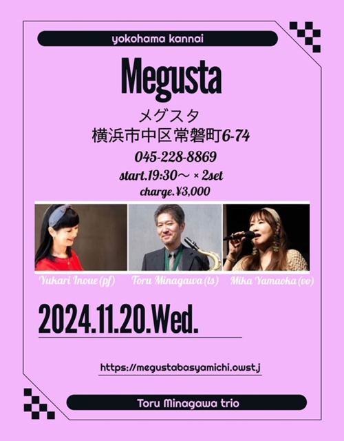 明日20日は、初出演の横浜メグスタにて❣️初めてのトリオのひとときも、どうぞお楽しみに😃🙏😃
