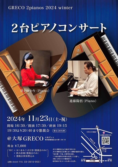 4月にご好評いただいた進藤陽悟さんとの2台ピアノ、今月23日半年ぶりに再演いたします❣️4手ならではの鍵盤の楽しさ、またどうぞごゆっくりです😃🙏😃 ◆11/23(祝・土)◆「2台ピアノ」 大塚「グレコ」(3916-955