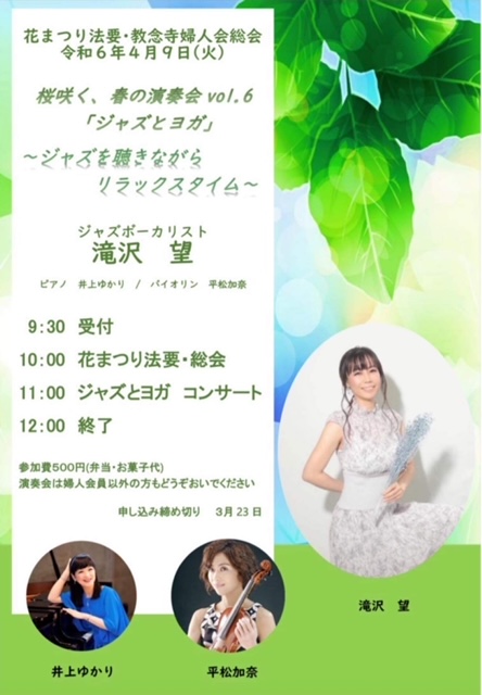 4/9に出演させていただく、静岡焼津『教念寺』での花まつりライブは、おかげさまで満席となりました❣️当日はごゆっくり楽しんでいただけますように😊💕😊 ◆4/9(火)◆ 「花まつり 教念寺ライブ」 静岡焼津「教念寺」(05