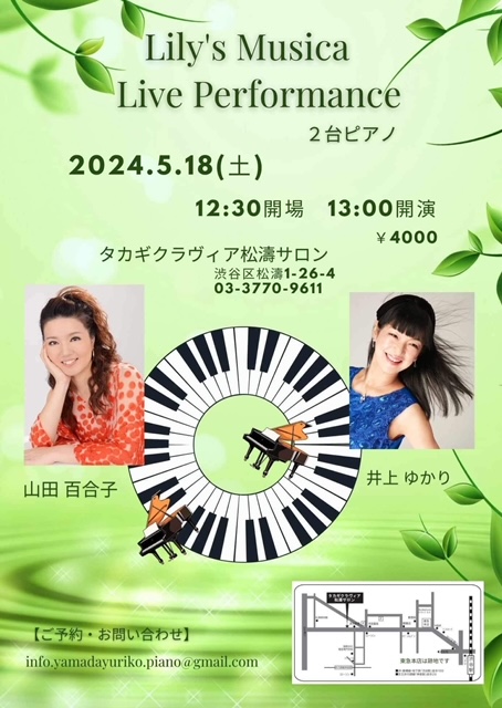5/18 松濤「タカギクラビーア」で一年ぶりにお届けする、百合子ちゃんとの2台ピアノ❣️あちこちからたくさんお問い合わせいただき、ありがとうございます。会場へのアクセスも改めてお知らせいたしますね😊💕😊 ◆5/18(土)
