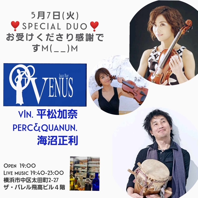 5/7 関内「ヴィーナス」は、代役をパーカッション海沼正利さんがお引き受けくださいました。みなさま、どうぞご了承下さいませ🙇🙏🙇