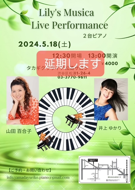 5/18に予定していました山田百合子さんとの2台ピアノは、12/1 同時刻、同じ会場にて日程延期させていただきます。みなさま、どうぞご了承くださいませ🙏🙏🙏