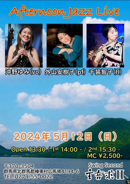 12日の群馬榛名「スウィングセカンド」は、ピアノの外山安樹子さんとフルートの千装智子さんが、代役をお引き受けくださいました。みなさま、どうぞご了承下さいませ🙇🙏🙇