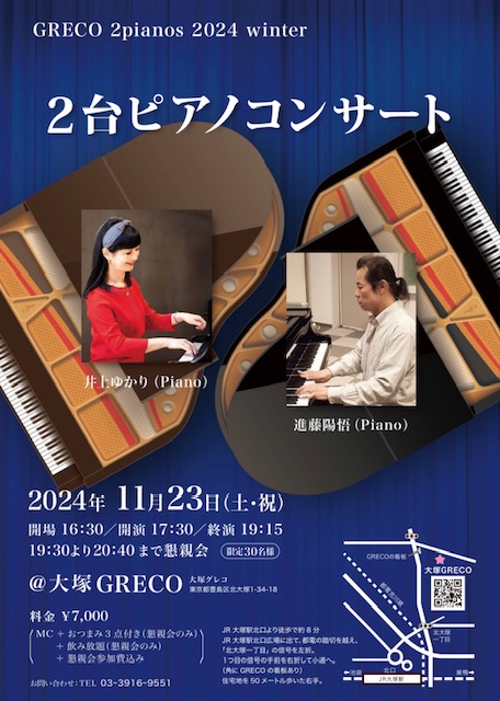 4月にお届けした進藤陽悟さんとの大塚「グレコ」での2台ピアノ、ご好評をいただき11/23に再演が決まりました❣️前回と同じく「ステージ&懇親会」で、楽しくご一緒できますように。お問い合わせは、お店までどうぞよろ