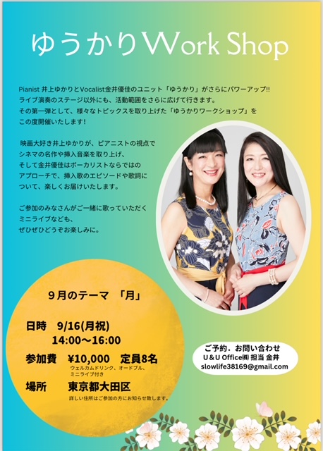 16日にお届けするワークショップの詳細を、改めてお知らせいたします❣️普段のライブとはまたひと味違ったアットホームなひととき、どうぞごゆっくり😊🙏😊 ◆9/16(月・祝)◆ 「ゆうかりワークショップ vol*1」 大田区