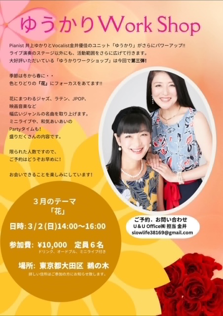 3/2にお届けする「ゆうかりワークショップ」の第3弾❣️今回は「花」をテーマに、幅広いジャンルの名曲にスポットをあてながらお届けいたします。ミニライブやパーティータイムも、どうぞごゆっくりお過ごしいただけますように😃⭐️