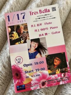 今月17日は、四谷「メビウス」にて「Tres Bella」❣️信平親分と潤一さんとの超お久しぶりなトリオ、どうぞごゆっくり😃⭐️😃 ◆1/17(金)◆「Tres Bella」 四谷「メビウス」(3342-3732) pm