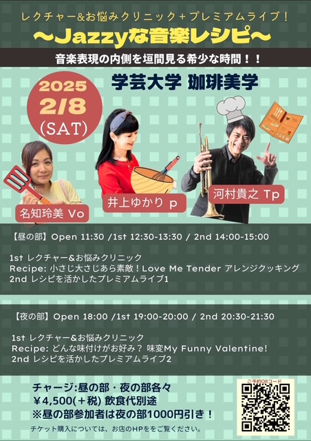 来月2/8にお届けする、玲美ちゃんと貴之さんとのワークショップ&ライブ❣️とってもレアな機会、ぜひたくさんの方々とご一緒できますように😃⭐️😃 ◆2/8(土)◆「Live & Workshop」 学芸大学「珈琲