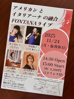 以前にお知らせしました11/24千葉『アートサロン』でのステージは、会場の建物の都合により、残念ながら急きょ開催中止となりました。新たな場所での日程が決まりましたら、またお知らせいたしますので、どうぞご了承くださいね😃🙏