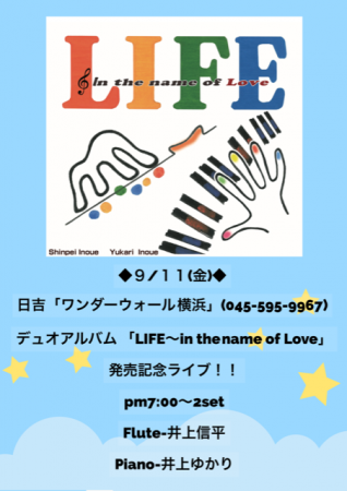 アルバム「LIFE」リリース記念ライブ、次回は9/11横浜日吉「ワンダーウォール横浜」にて❣️今年の後半にかけては日吉〜代々木〜阿佐ヶ谷〜吉祥寺と、LIFEの音の旅は続きます😊❤️😊